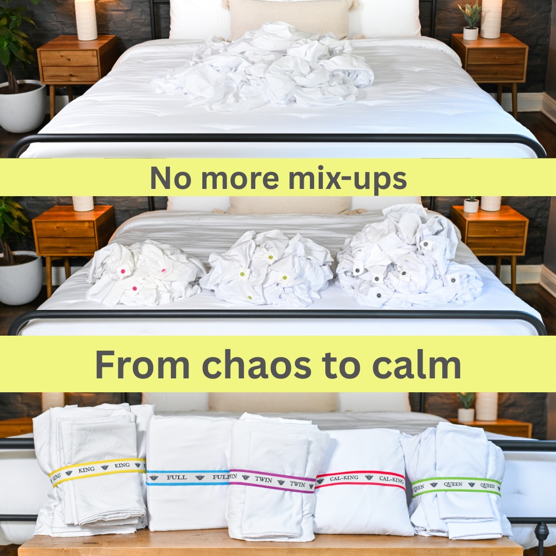 For folded sets, comforters/blankets, or specialty bundles, many hosts also use BeeBands to secure grouped linens without separating pieces during storage or transport.